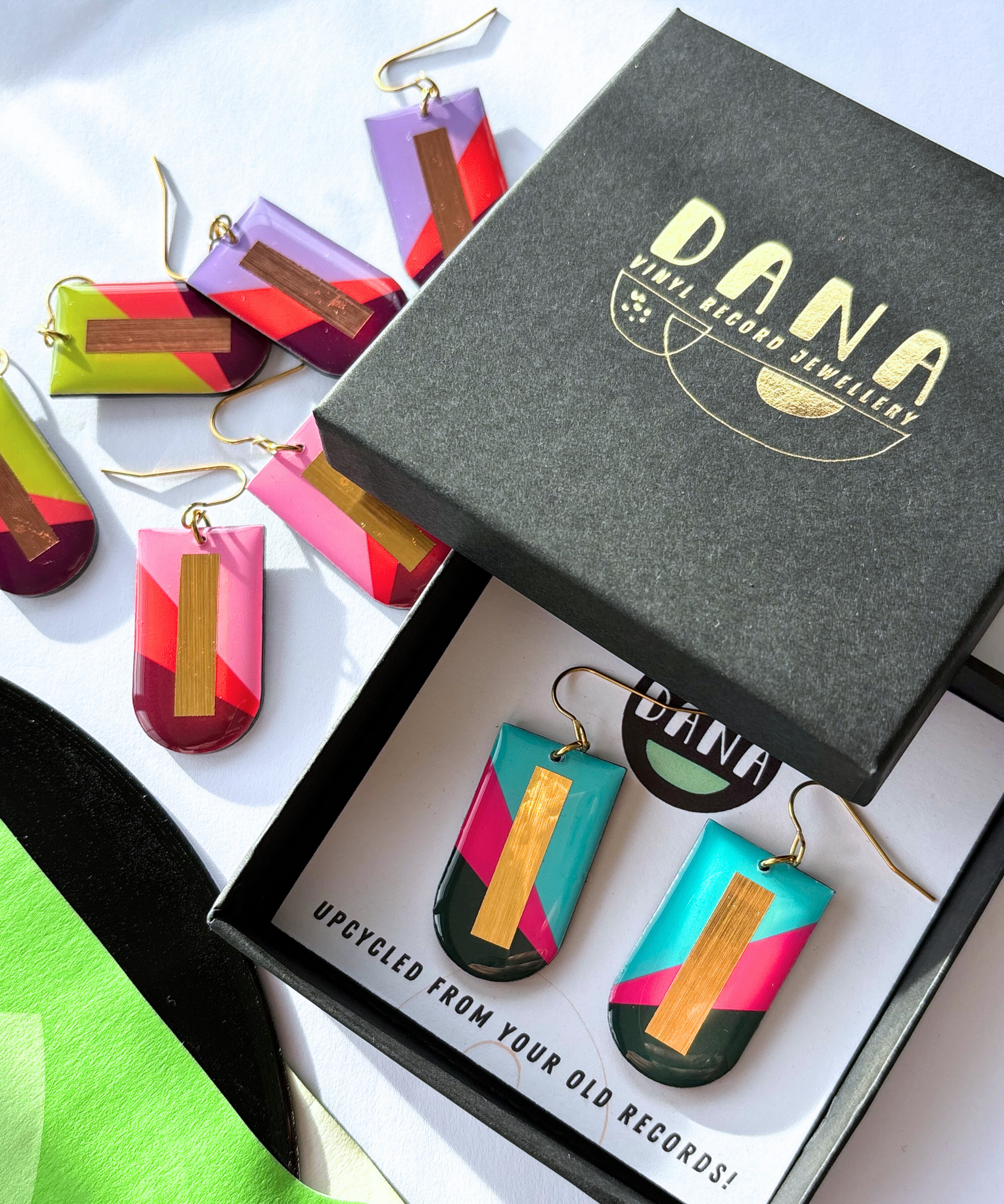 DANA jewellery designs are made using unwanted and beat up vinyl records, saved from ending up in landfill, that once played music for someone, somewhere, back in the day. Each pair carries its own story etched into the grooves of the record and a new chapter is about to begin with you. Yup, rubbish has never looked better.