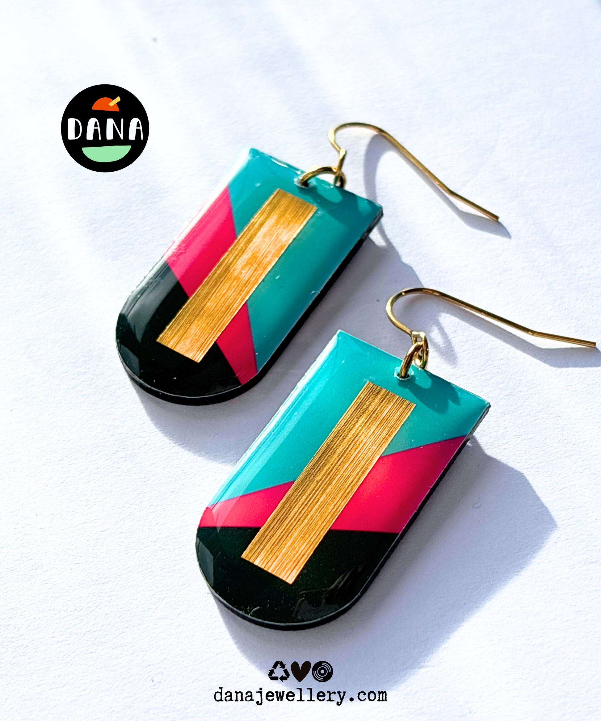 The NINA recycled record earrings in turquoise, fuchsia, deep khaki, and gold are defined by clean lines and solid shapes for an elegant -yet fun- style. The mid-century modern aesthetic is only reinforced by the bold gold geometric gold accents that really make the earrings come to life as they dangle in the light. To make these extra special, the backs of these feature the original unaltered vinyl record in all its groovy glory (see 5th photo).