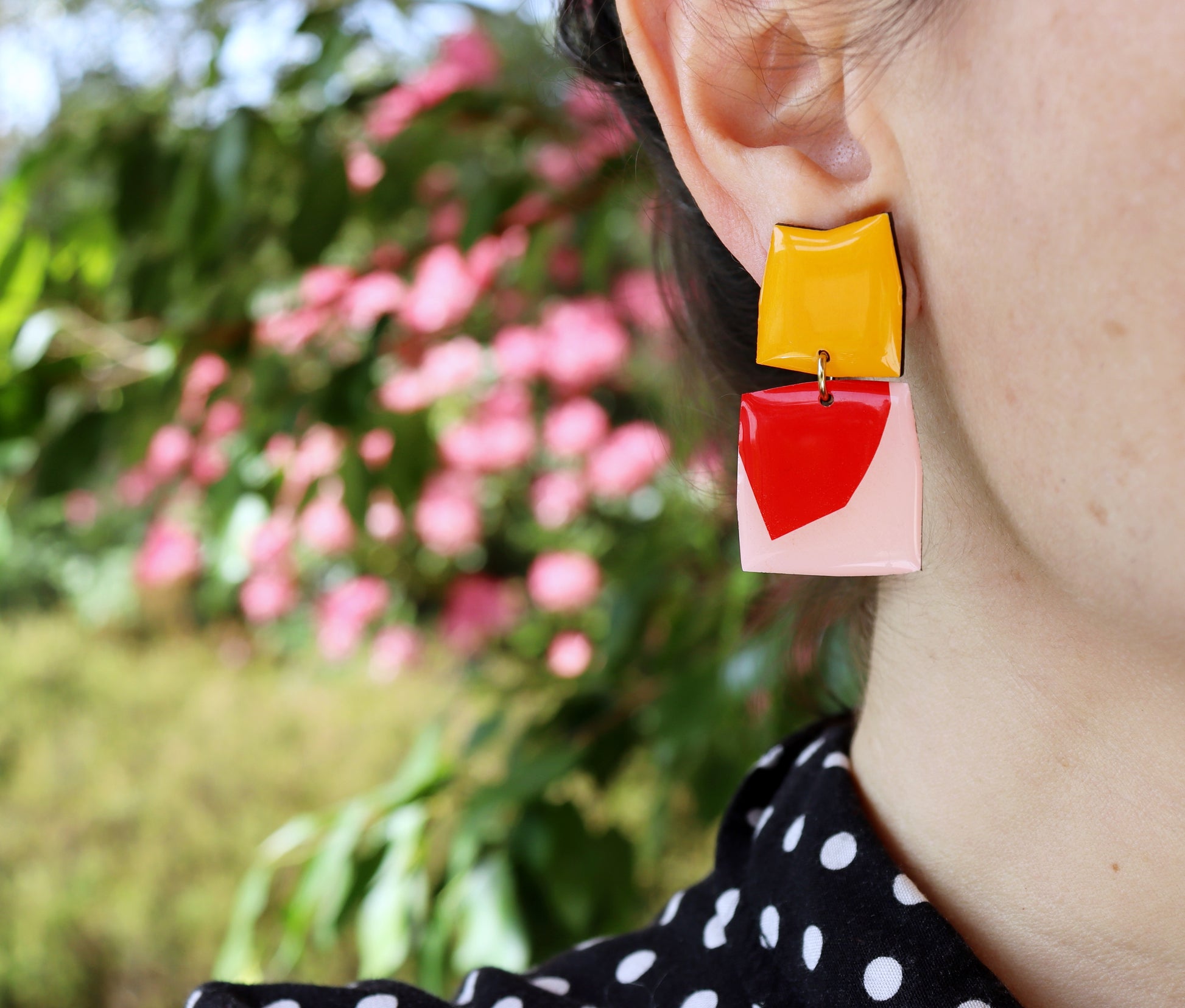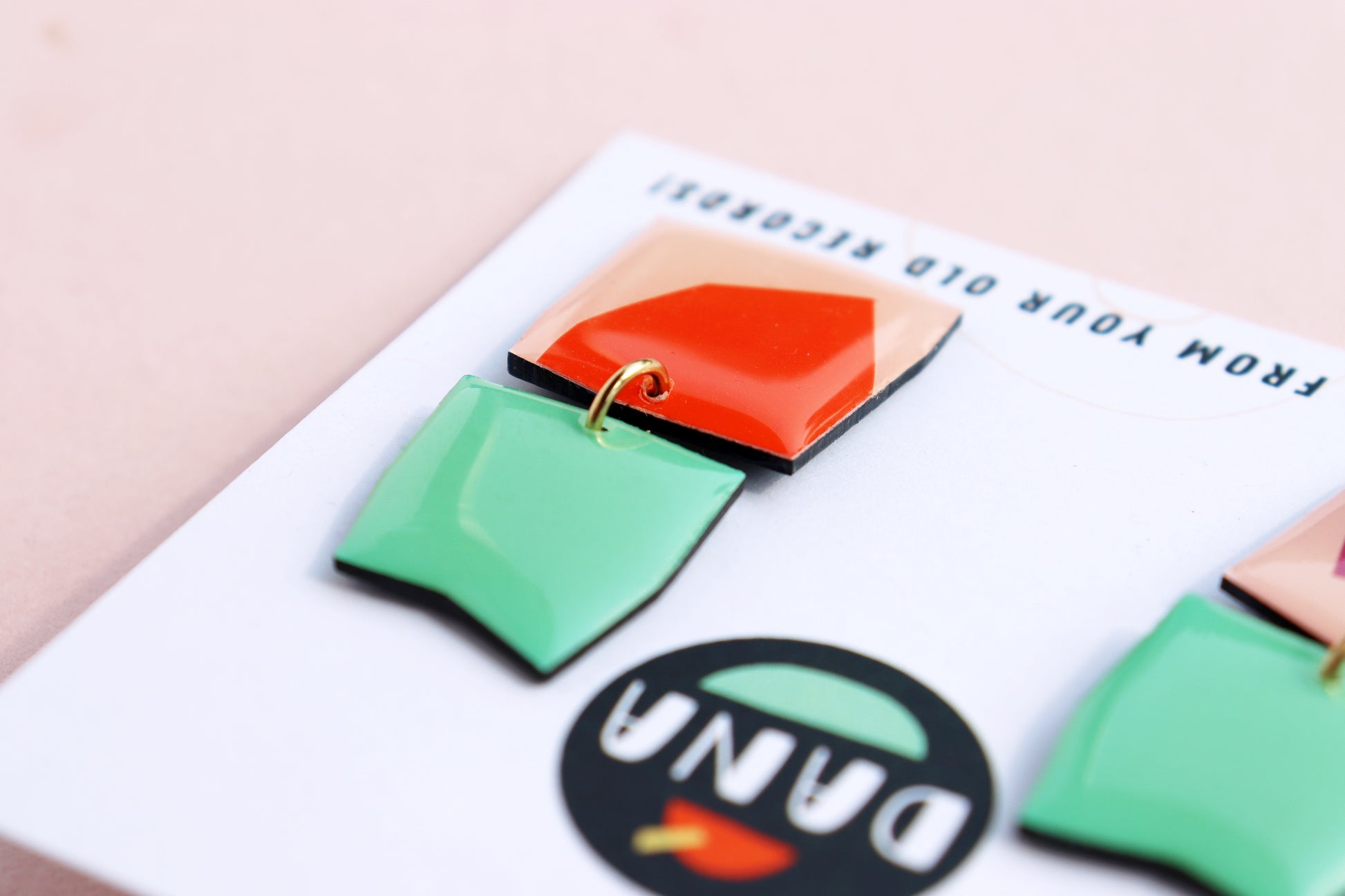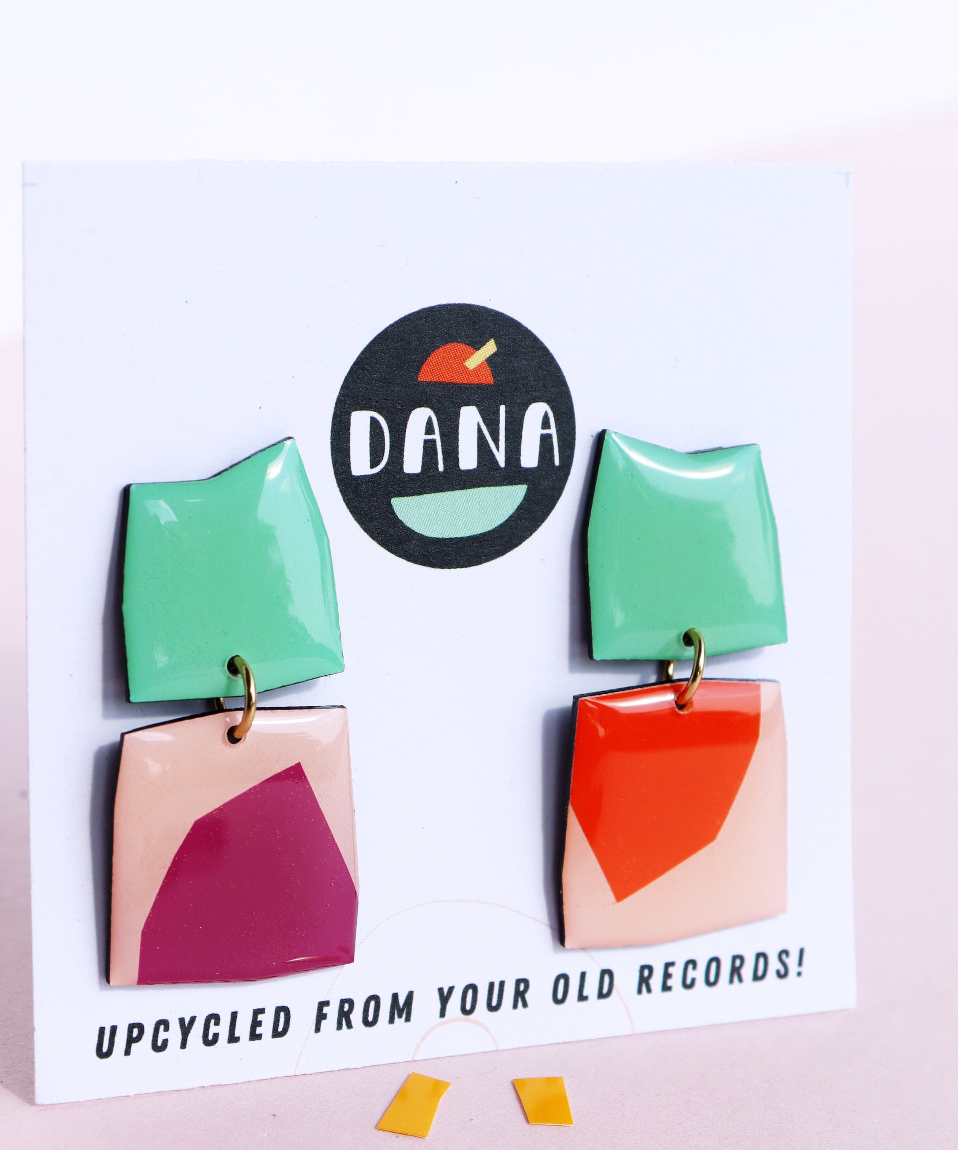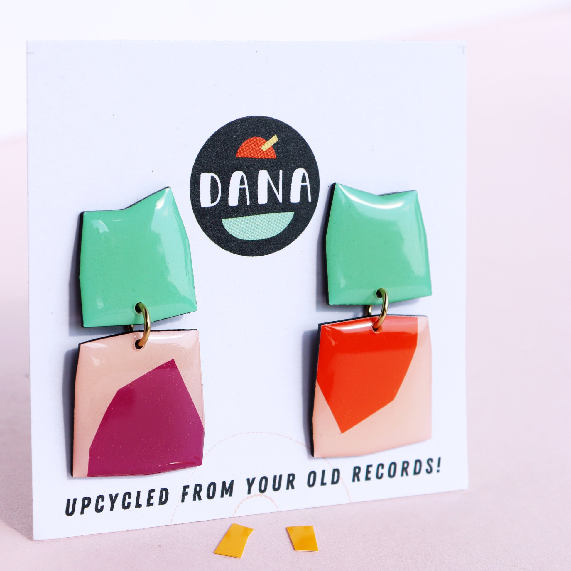 These bold and abstract large dangly studs are a fab present for the vinyl enthusiast in your life or the lover of quirky art jewellery or unique upcycled design. All pieces are slow made in my little home studio in Co. Kerry, from vinyl records saved from ending up in landfill. Yup, rubbish has never looked better.