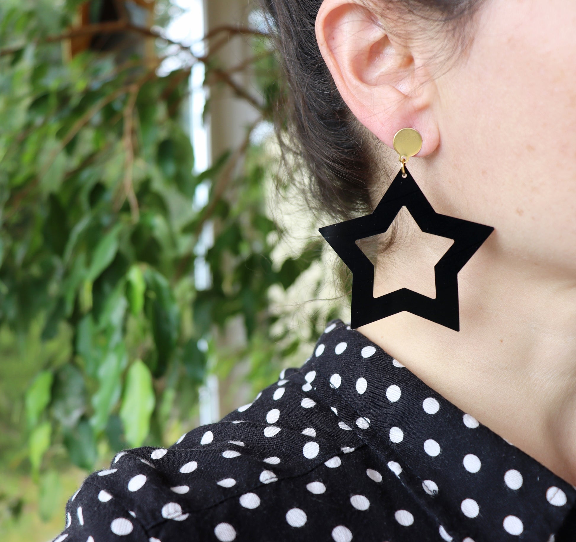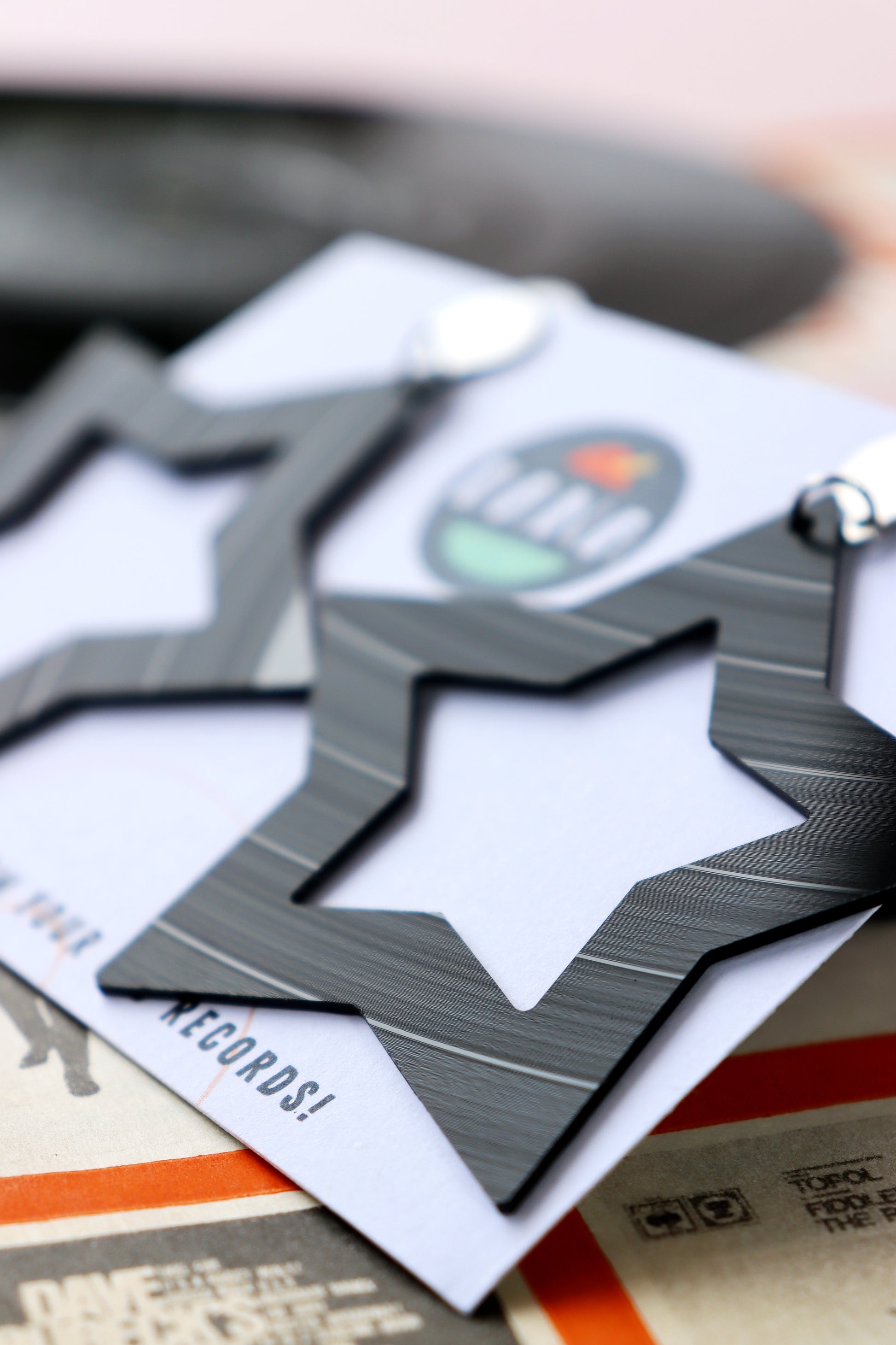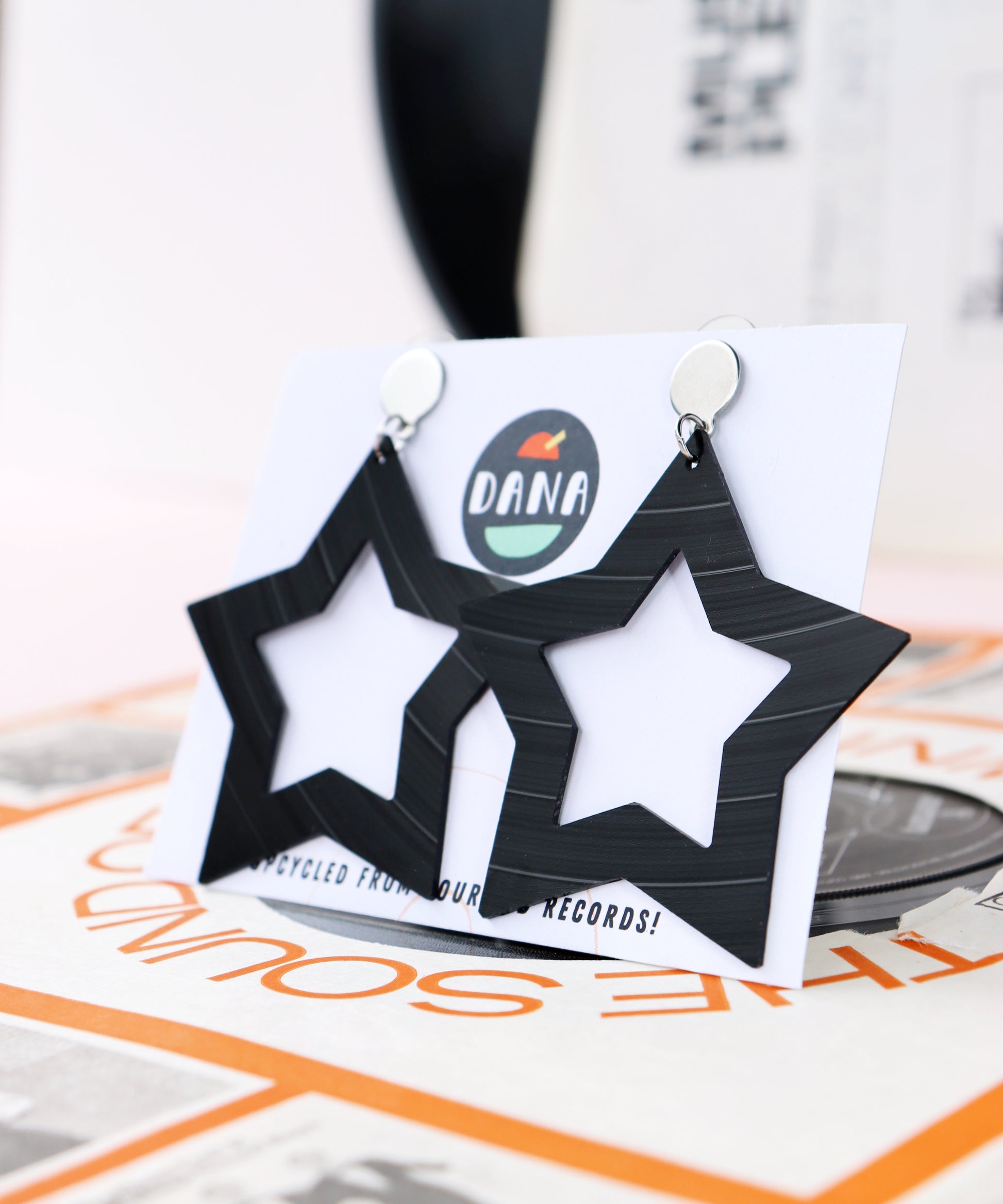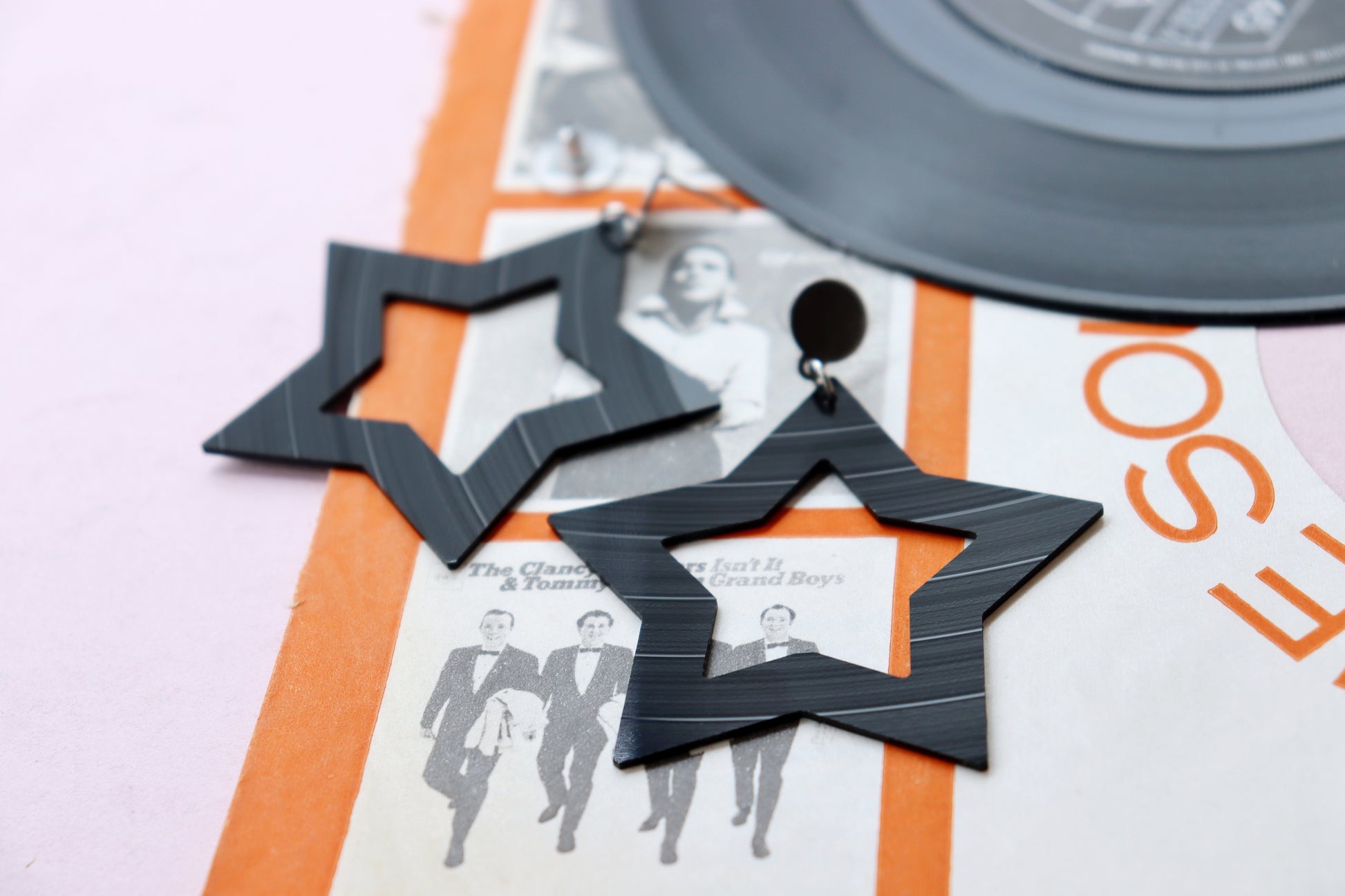 The large black vinyl record star earrings are big and bold and oh so very groovy... literally. Available on gold or silver tone ear posts (see 5th photo) just pick your favorite.