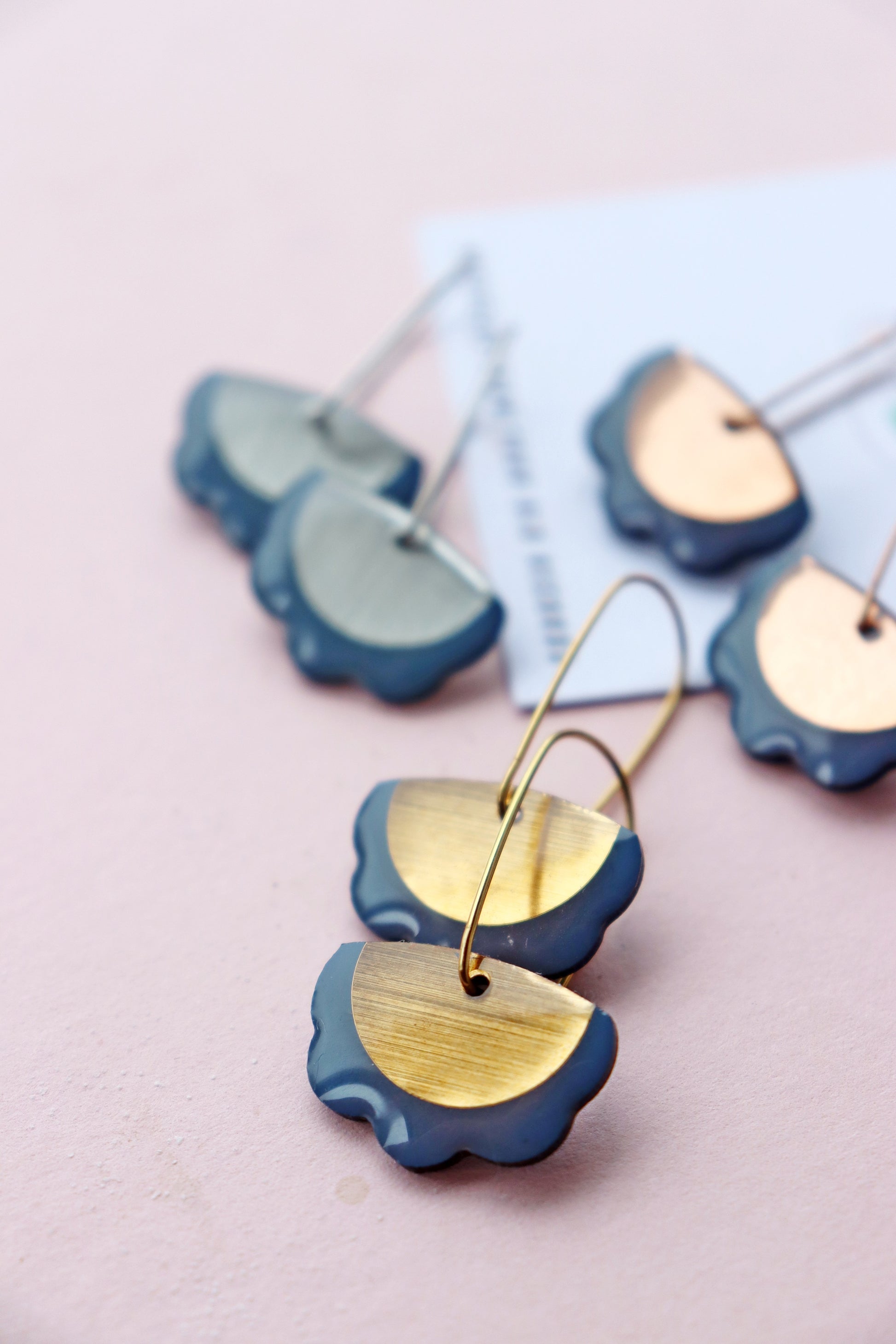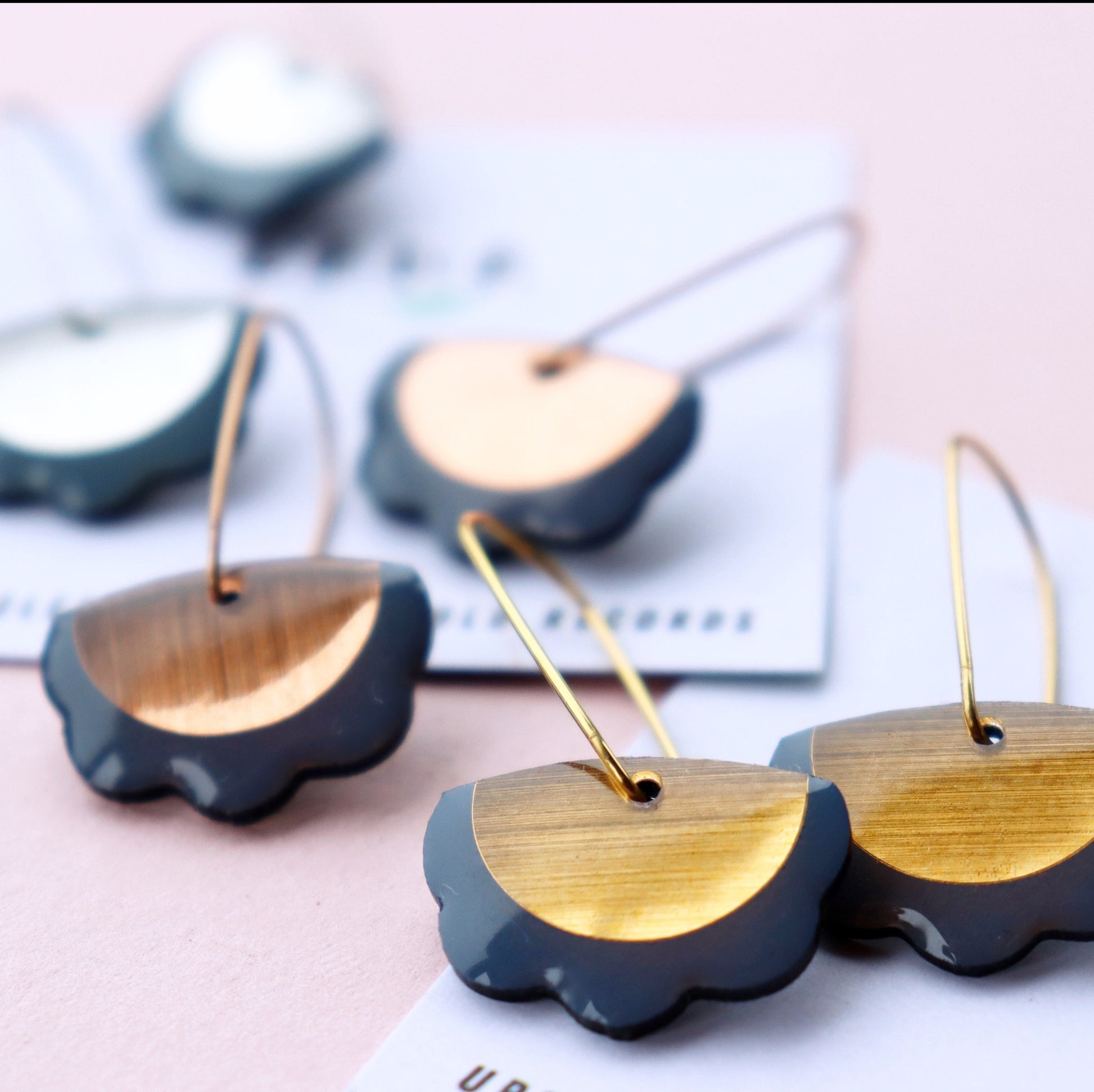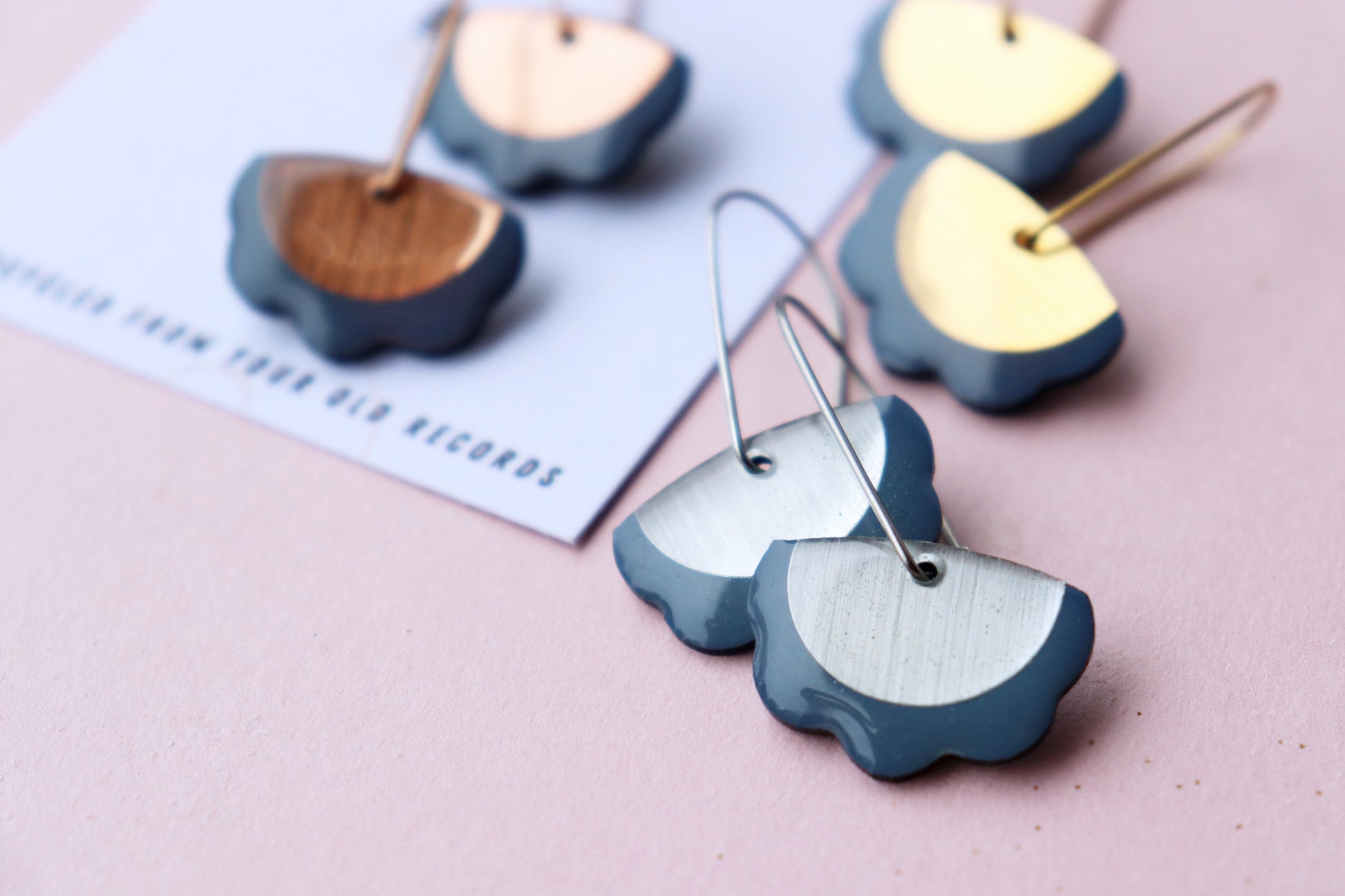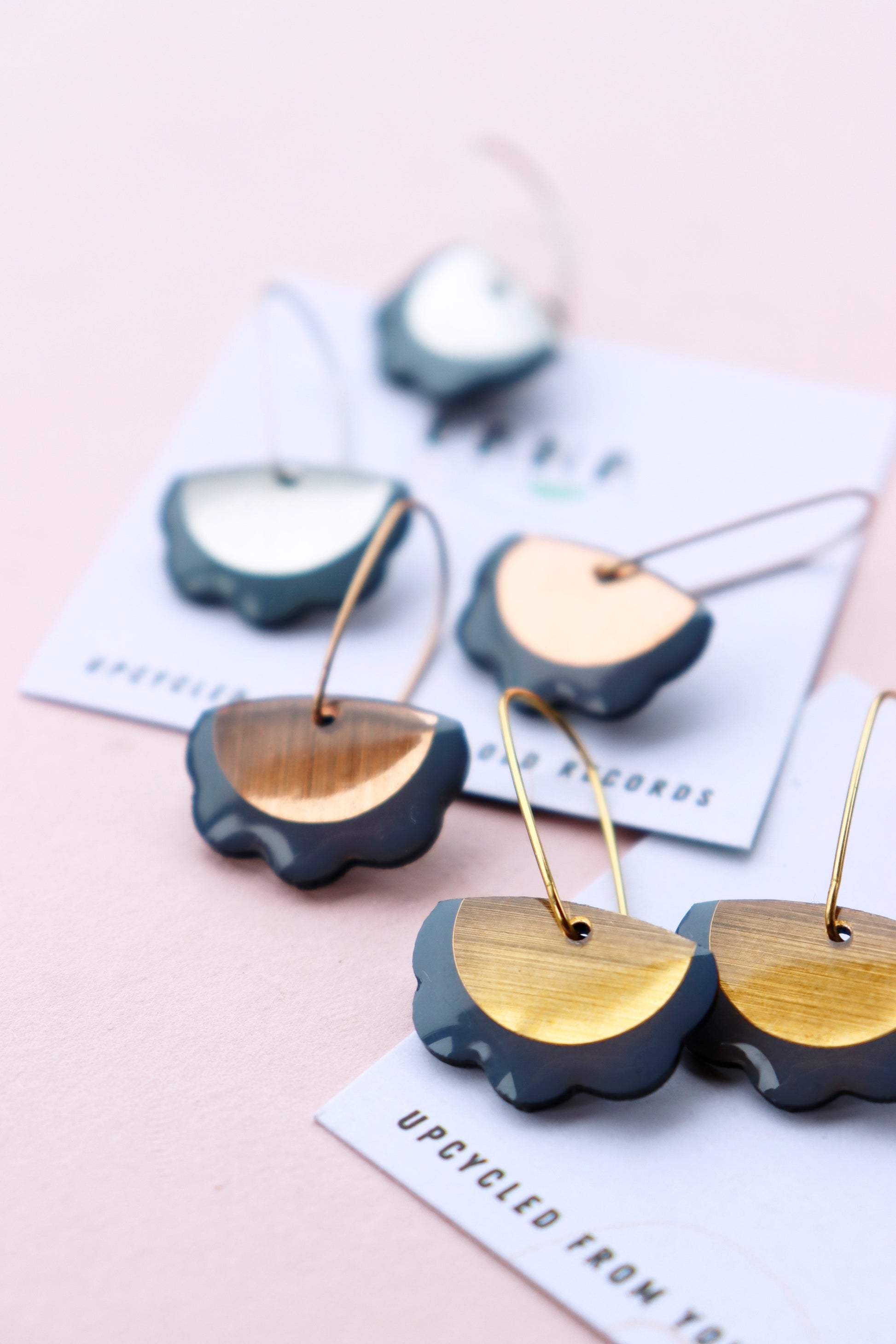 Minimal with a subtle touch of metallic shine, the dainty Froufrou earrings are upcycled from a vinyl record that was saved from going to landfill. Oh you will love how the light dances over the metallic details. A great present for vinyl lovers, sustainable fashion enthusiasts or anyone on the lookout for that bold unique jewellery design.