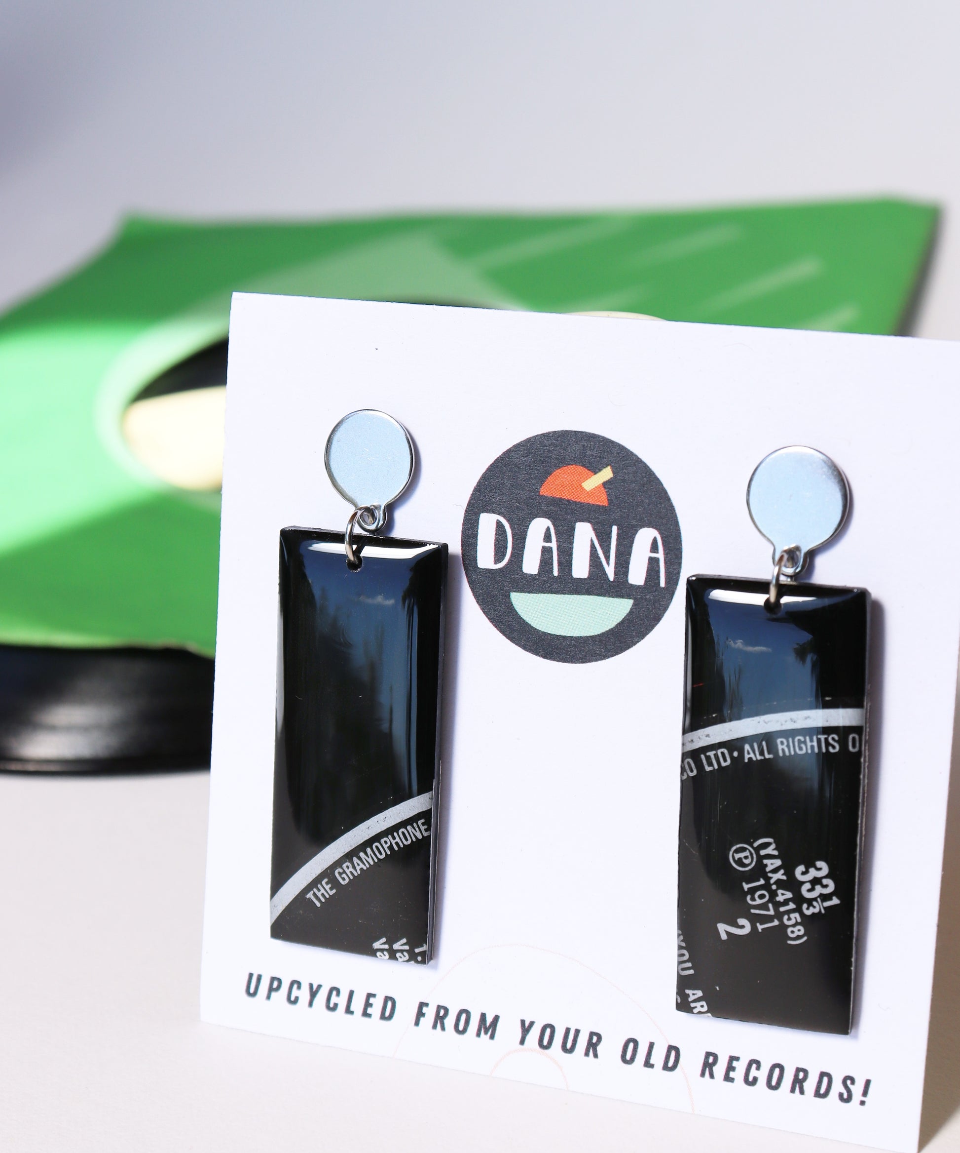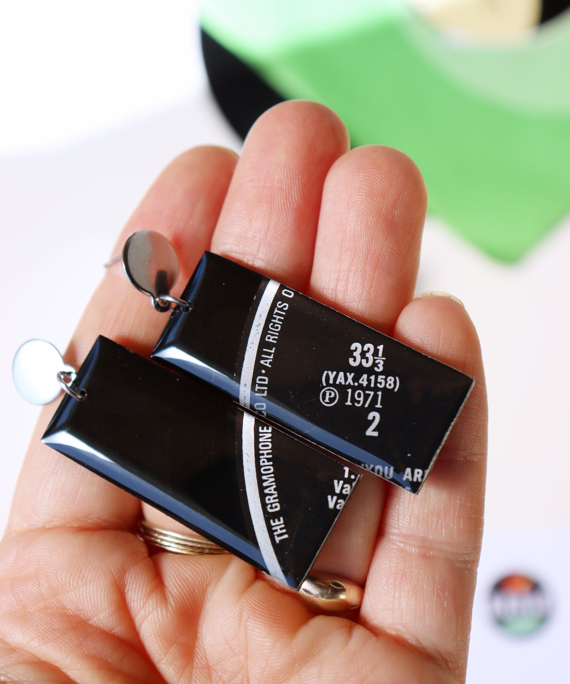 One of a kind vinyl record earrings that used to spin on a turntable in a retro sitting room back in the day? Yup. And even better; these were saved from ending up in a landfill after spending a looong time in a dusty shed, or attic… or who knows where.