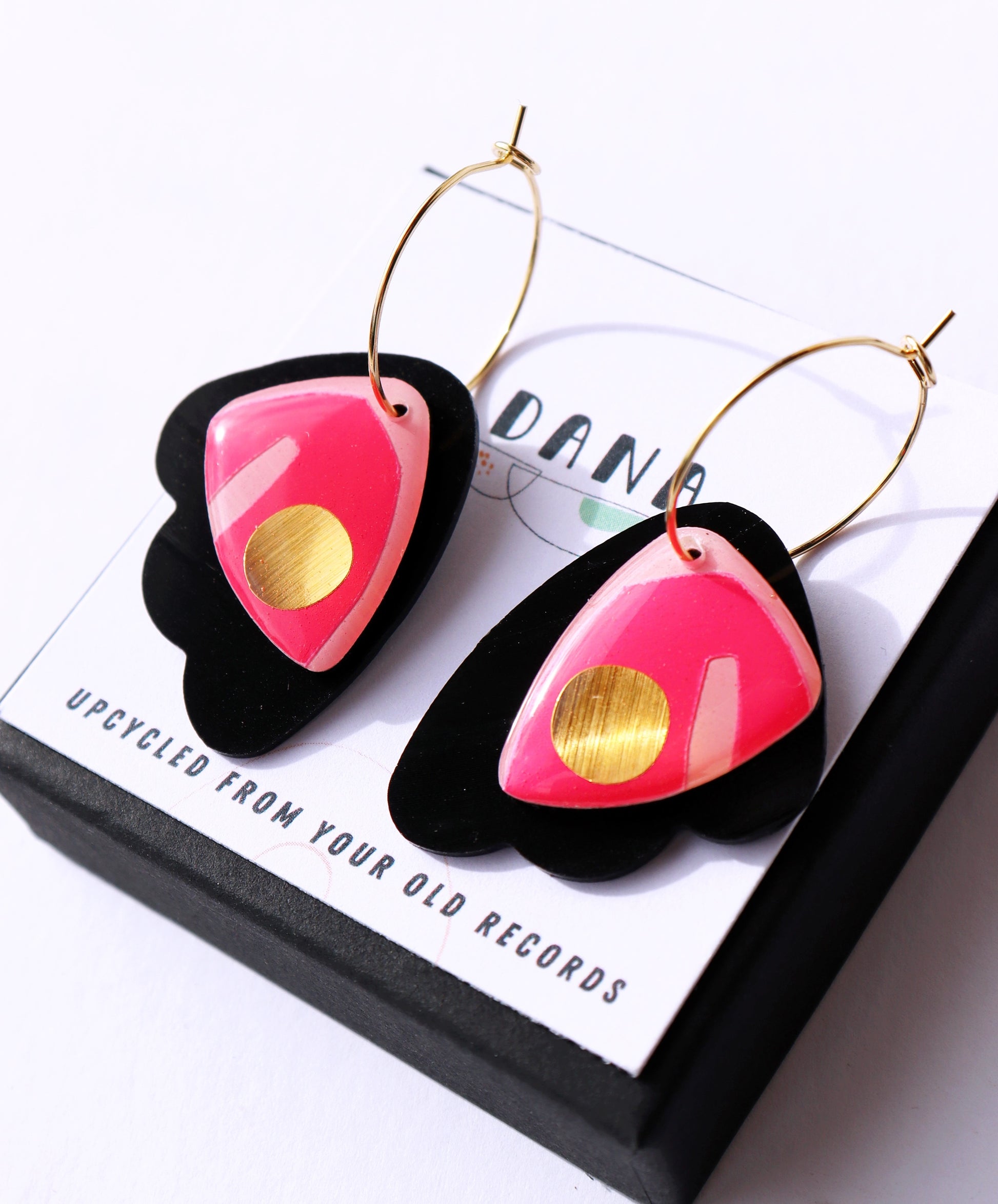 These danglies in vibrant pink and black with a bold pop of gold are upcycled from an old vinyl record that was headed for landfill. Literally groovy, the front piece dangles freely over the black back vinyl record piece for a very fun and dynamic look. They are a great present for vinyl lovers, sustainable fashion enthusiasts or anyone on the lookout for that bold unique handmade accessory.