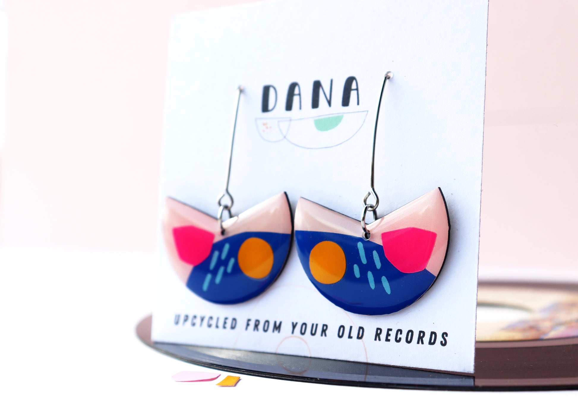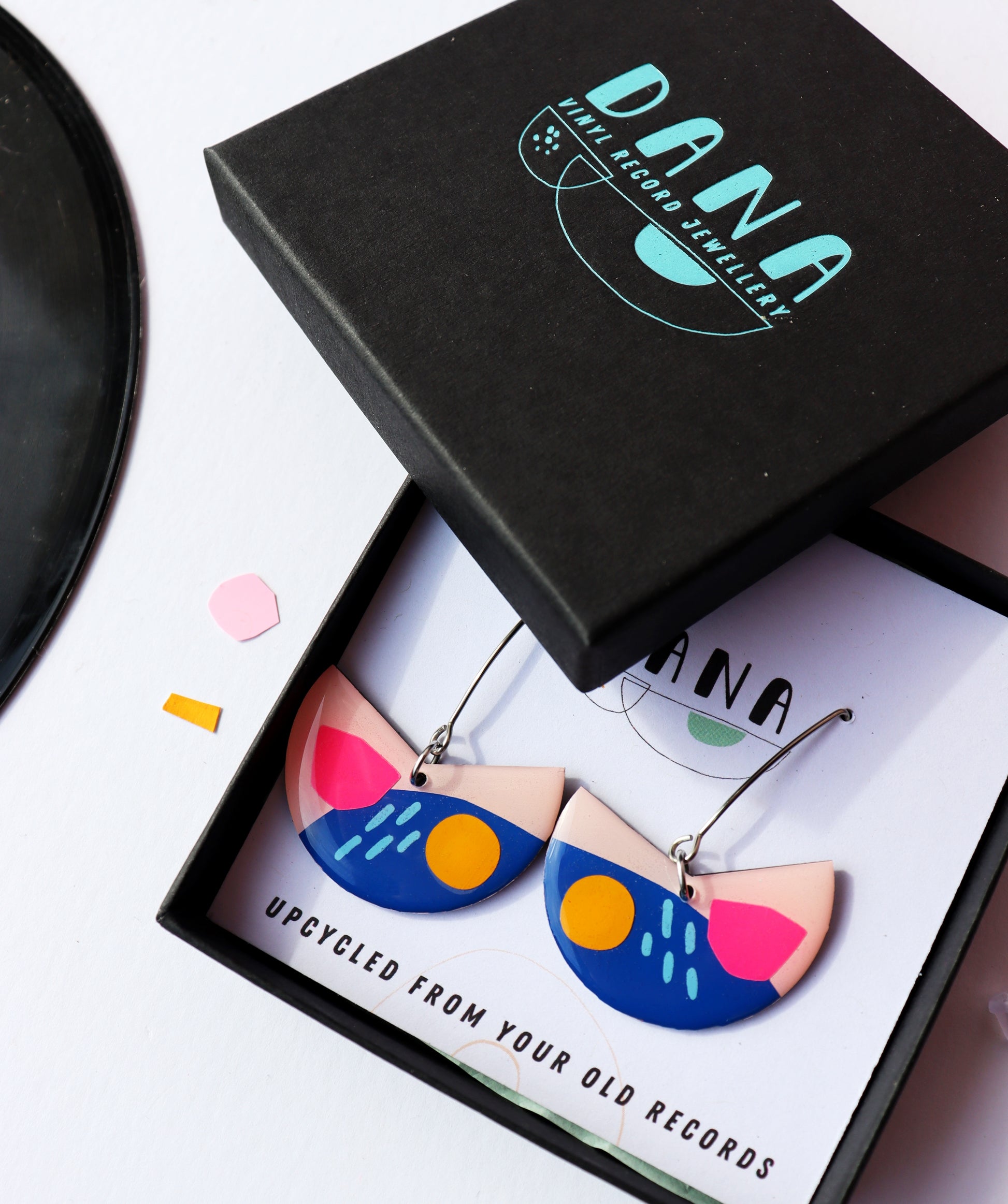 The PACMAN earrings in blue, yellow and hot pink are upcycled from an old vinyl record that was headed for landfill and are made using the analogue collage technique. Literally groovy, you can admire the original record in all its groovy glory at the back of the earrings. They are a great present for vinyl lovers, sustainable fashion enthusiasts or anyone on the lookout for that bold unique handmade accessory.