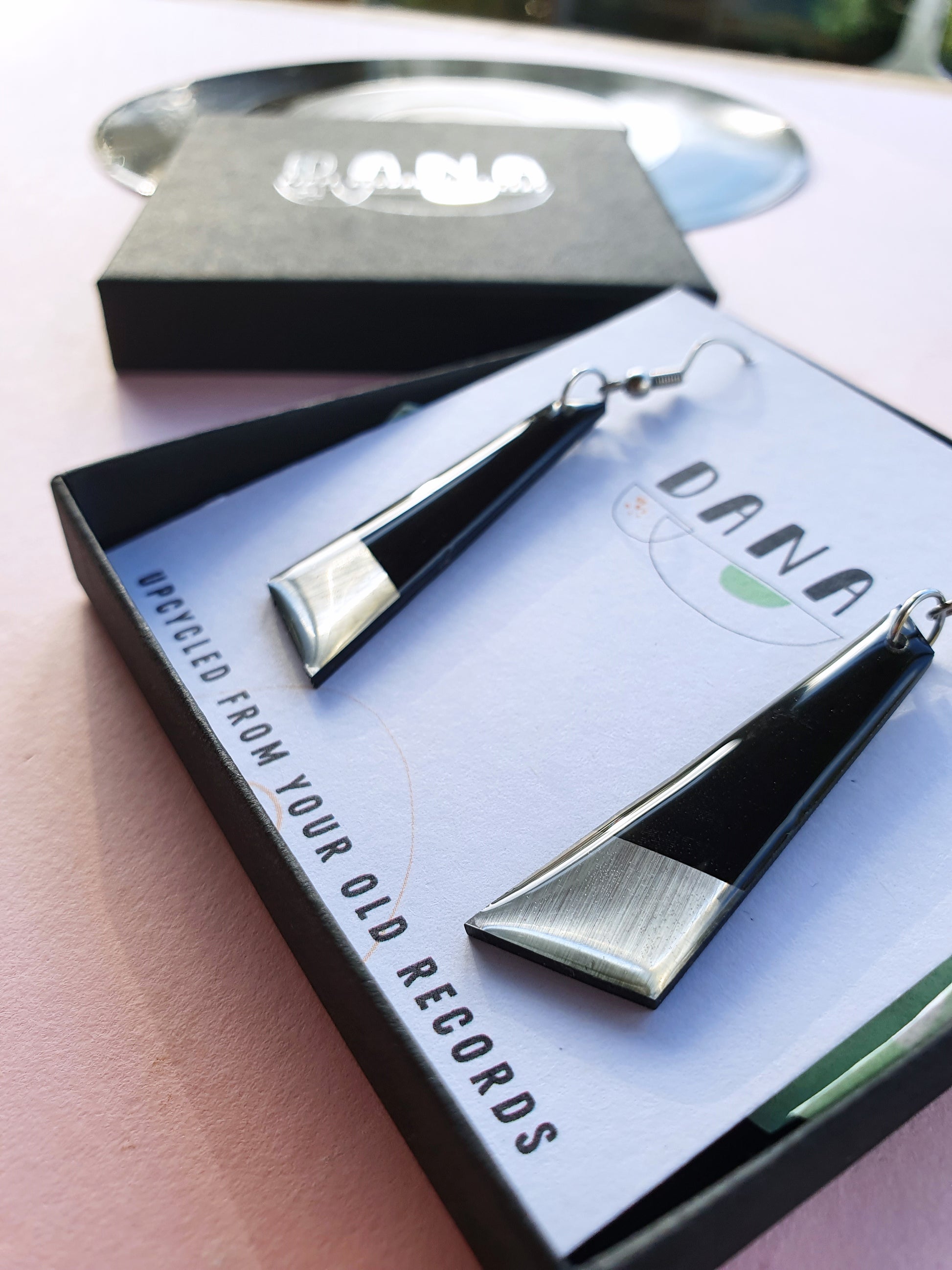 These contemporary casual chic earrings are handcrafted from a recycled vinyl record. Coated with a plant based resin, you will absolutely love how the light plays on the metallic details as they dangle, for that perfect subtle touch of glam. The back is literally groovy as the vinyl record is left in its pure untouched state. A perfect gift for any sustainable fashion enthusiast, vinyl record lover or just as a unique treat to yourself!
