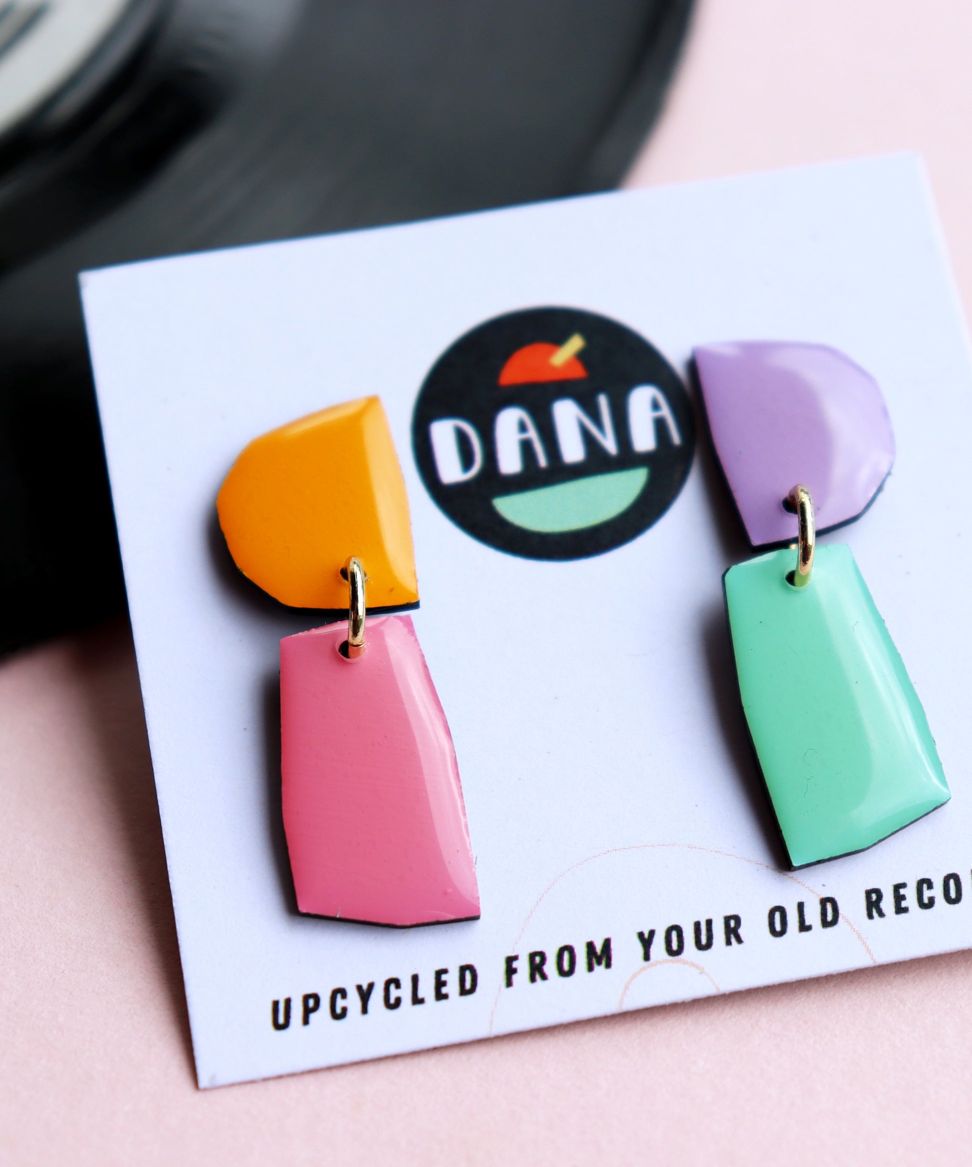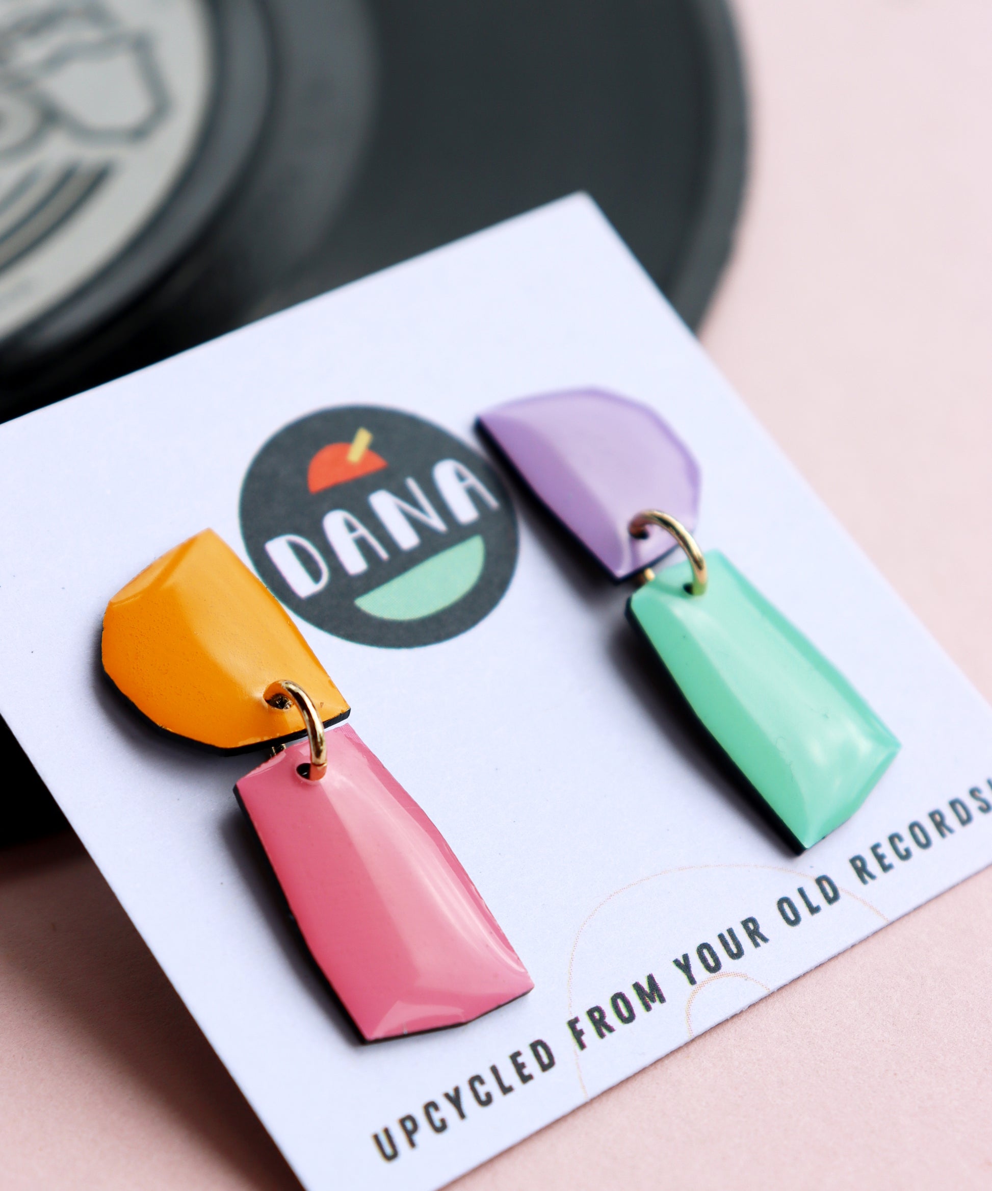 The MINNIE upcycled vinyl record earrings in are bold and quirky. This design is a fab present for the vinyl enthusiast in your life or the lover of quirky art jewellery or unique upcycled design. All pieces are made with intention in my little home studio in Co. Kerry, from vinyl records saved from ending up in landfill. Yup, rubbish has never looked better.