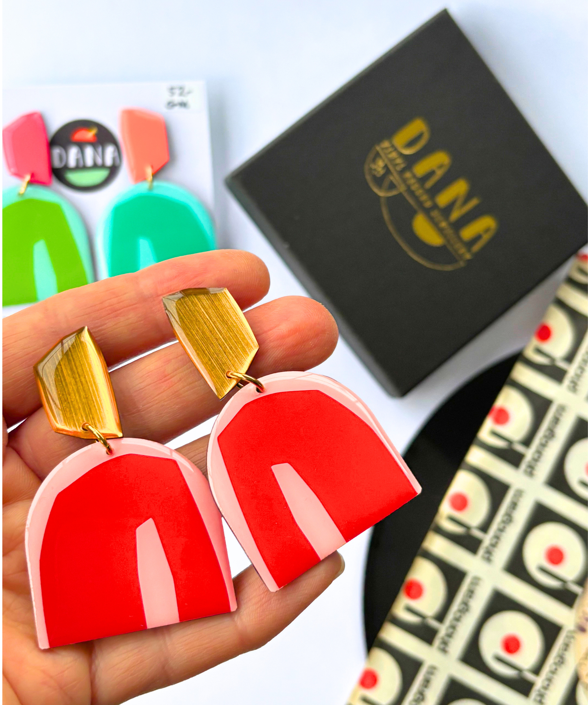 The bold PATTI dangles in vibrant red and lush gold are upcycled from an old vinyl record that was headed for landfill. They are a great present for vinyl lovers, sustainable fashion enthusiasts or anyone on the lookout for that bold artsy accessory.