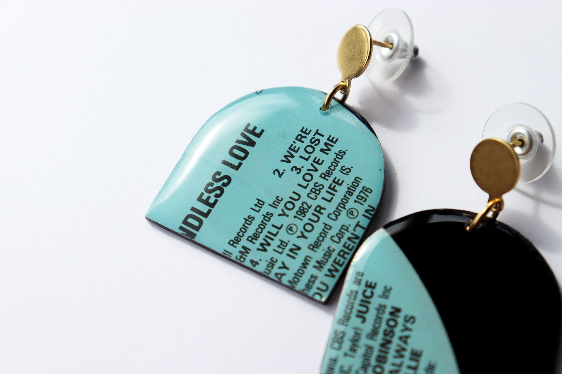 WILL YOU LOVE ME / 1982 / Endless Love compilation / upcycled arch vinyl record earrings in aqua and black / ONE OF A KIND